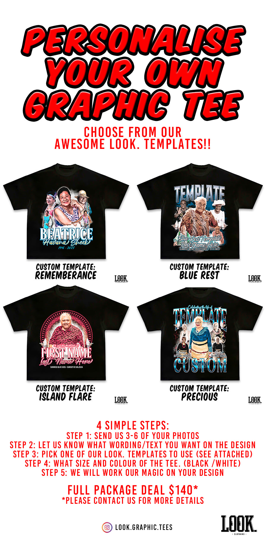 Step 3: Pick one of our LOOK. Templates to use (see attached) We can change the colors of the fonts and background, can also change the font too.